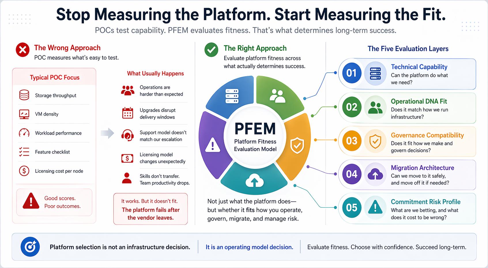 Most organizations evaluate private cloud and HCI platforms by running a technical POC. The POC passes. The platform fails. The reason is structural — and fixable. The Platform Fitness Evaluation Model (PFEM) tells you what to measure instead.