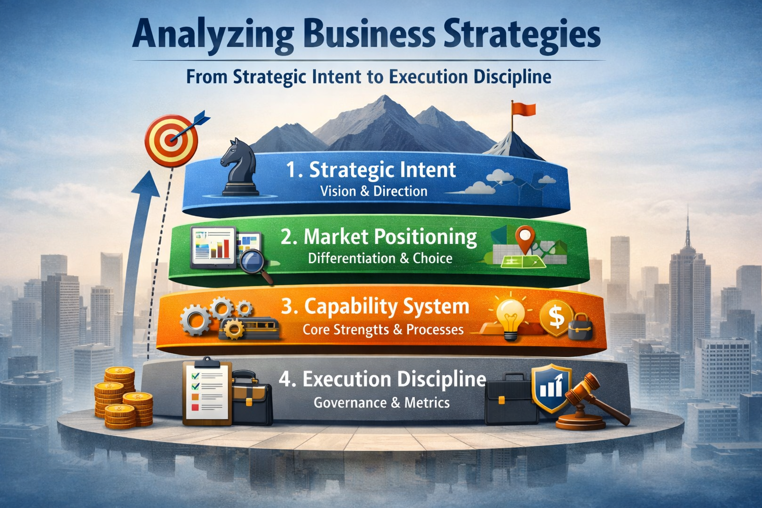 A structured executive guide to analyzing business strategies using a four-layer framework that connects intent, positioning, capability, and execution discipline.