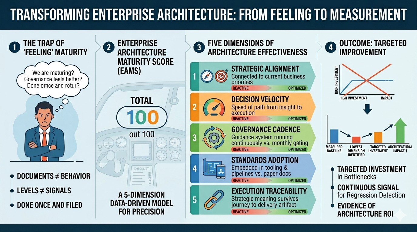 Enterprise architecture maturity is not a feeling. It is a score. Organizations that cannot measure their architecture maturity cannot improve it. The EAMS model gives you the score.